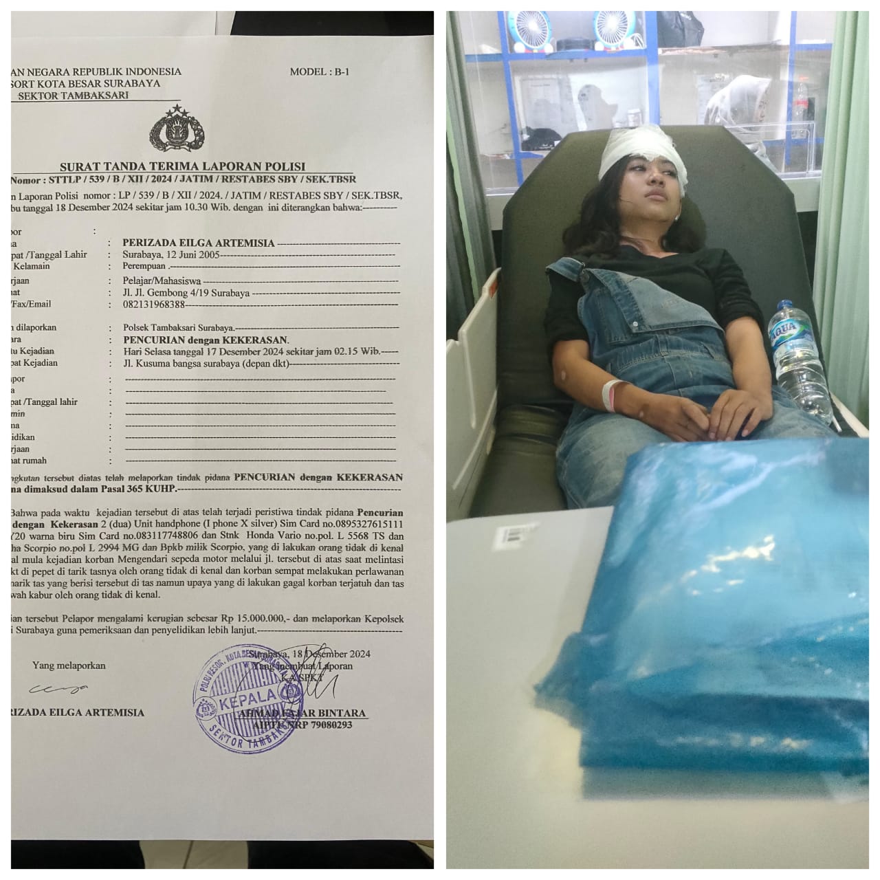 Selanjutnya, korban melaporkan kejadian Jambret tersebut ke Polsek Tambaksari Surabaya dengan nomor :STTLP/539/B/XII/2024/JATIM/RESTABES SBY/SEK TBSR.