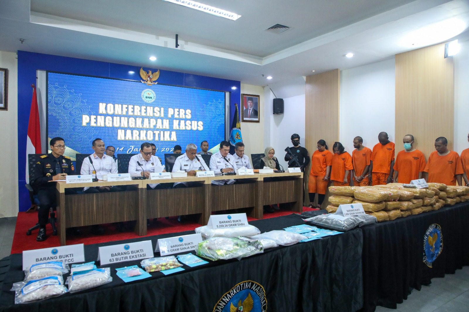 Dari ke-11 kasus tindak pidana narkotika yang melibatkan 44 orang tersangka, Tim Gabungan mengamankan barang bukti berupa: 5.259,34 gram sabu; 50.992,13 gram ganja; 45,45 gram ganja sintetis (tembakau gorilla); 63 butir ekstasi; 2.680 butir PCC; dan 3.896 gram cathinone. Dengan jumlah barang bukti narkotika yang berhasil disita, sebanyak 39.092 jiwa masyarakat Indonesia berhasil diselamatkan dari potensi penyalahgunaan narkotika.