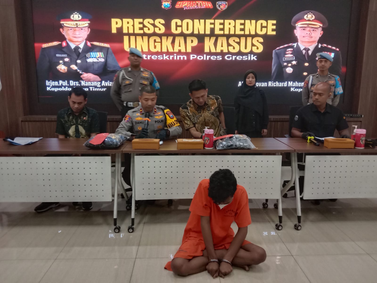 Kemudian barang bukti yaitu ada 1 (Satu) potong Jaket warna hitam, 1 (Satu) potong celana jeans panjang warna biru, 1 (Satu) potong Celana dalam warna Putih, 1 (satu) potong BH warna abu-abu, 1 (satu) potong kaos lengan pendek warna hitam, 1 (satu) potong Hoodie warna Hitam, 1 (satu) potong Celana panjang warna hitam dan1 (satu) celana dalam warna hitam,” Ujar Wakapolres Gresik saat melakukan konferensi Pers di Mapolres Gresik, Jumat (08/5/25).