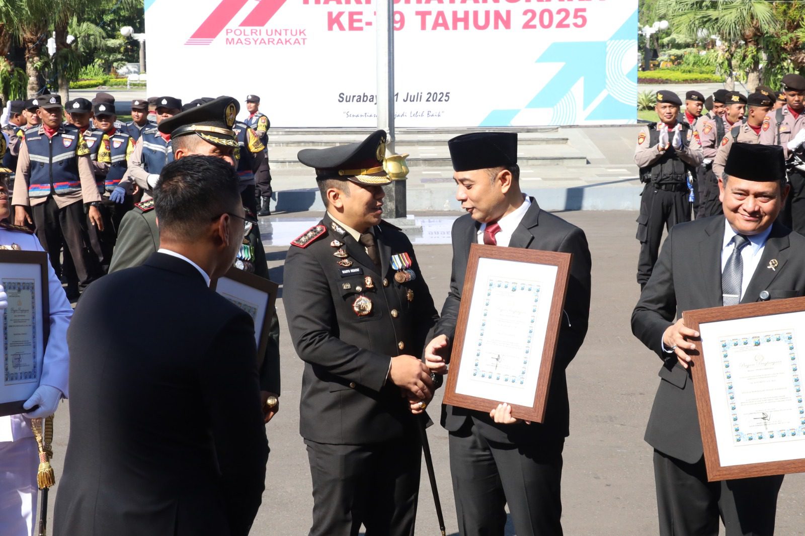 Dalam upacara peringatan HUT Bhayangkara ke-79 di Balai Kota Surabaya, Kapolrestabes Surabaya Kombes Pol Lutfi Sulistiawan bertugas sebagai Inspektur Upacara (Irup).