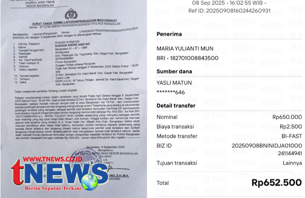 Bangkalan, Jatim || tNews.co.id – Kasus penipuan daring kembali memakan korban di Bangkalan. Seorang warga bernama Sukron Andre Ansyah resmi melaporkan dugaan penipuan kos-kosan fiktif melalui aplikasi TikTok ke Polres Bangkalan pada Selasa (9 September 2025).