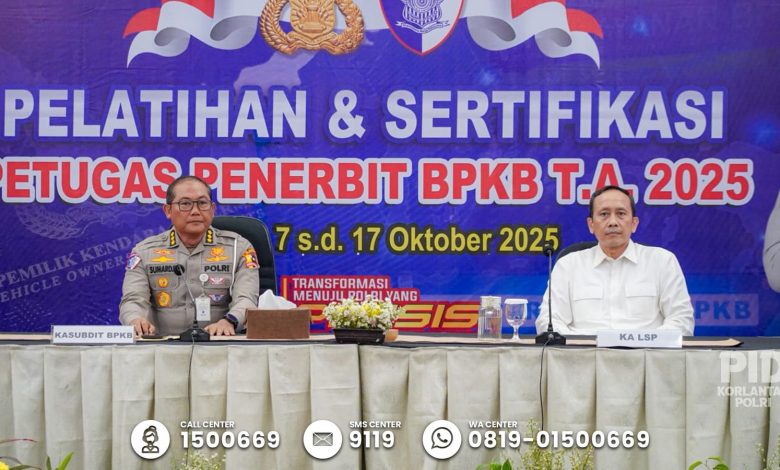 JAKARTA, tNews.co.id — Kegiatan Sertifikasi Petugas Penerbit Buku Pemilik Kendaraan Bermotor (BPKB) Tahun Anggaran 2025 resmi dibuka pada Selasa (14/10/2025) di Cililitan, Jakarta. Pembukaan dilakukan langsung oleh Kasubdit BPKB Ditregident Korlantas Polri, Kombes Pol Sumardji. Kegiatan ini menjadi langkah strategis dalam mendukung transformasi digital layanan kepolisian, termasuk implementasi BPKB elektronik.