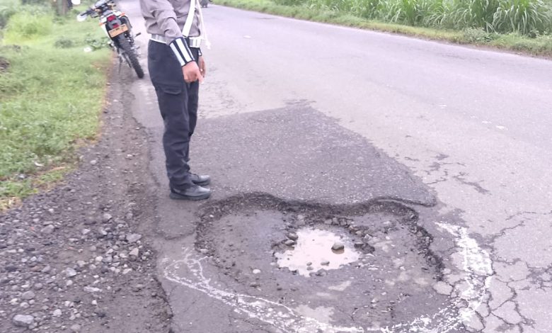 Anggota Satlantas Polres Kediri Kabupaten saat ditemui dilokasi jalan berlubang, menyampaikan bahwa di Jalan Desa tego Wangi kec Plemahan Kediri Jatim. terdapat lubang jalan dengan kondisi cukup parah.