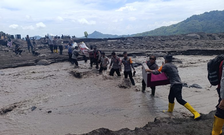 Personel Gabungan Polda Jatim Lakukan Aksi Kemanusiaan Pascabanjir Lahar Semeru di Lumajang