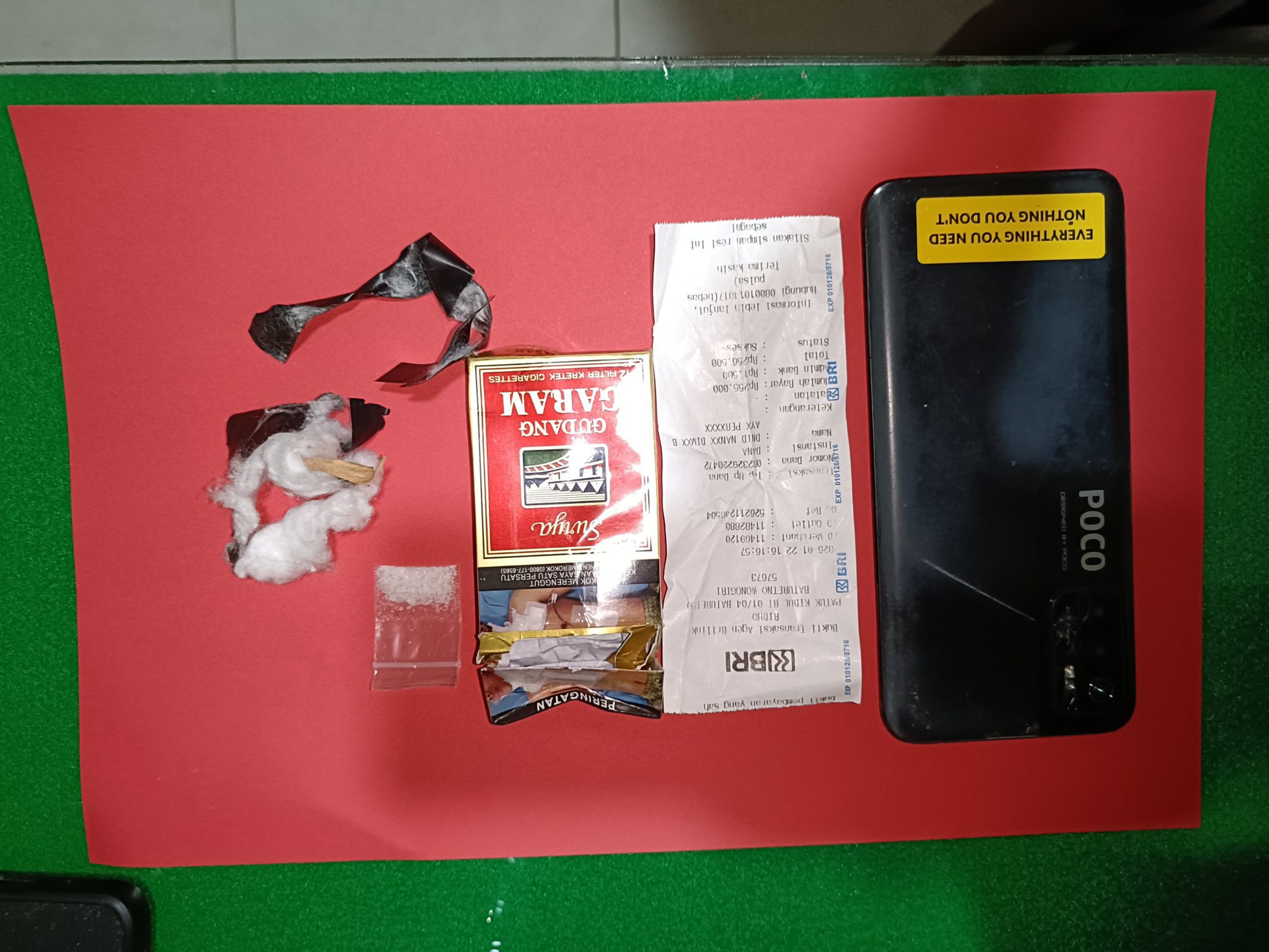 Selain satu paket sabu, polisi juga menyita sejumlah barang bukti pendukung, antara lain plester hitam, kapas, bungkus rokok, bukti transfer, serta satu unit telepon genggam yang diduga berkaitan dengan aktivitas penyalahgunaan narkotika.
