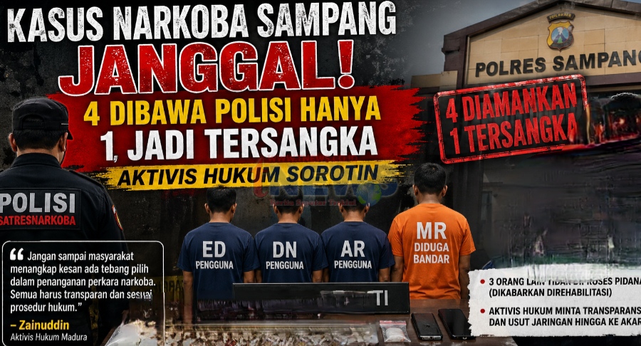 SAMPANG, Madura II tNews.co.id – Pengungkapan kasus narkoba oleh Tim Satnarkoba Polres Sampang yang sempat mengamankan empat orang di wilayah Kota Sampang menuai sorotan publik. Dari empat orang yang diamankan, kini hanya satu orang yang ditetapkan sebagai tersangka.